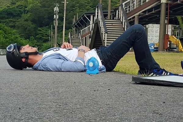 可以就這樣躺著演嗎? 哥已經熱到溶化,曬到無力啦! 但,幸好有把大傘跟小風扇給我那一點點的幸福。 拍完相信大家都變黑人了,辛苦了。。。(by 謝佳見FB)